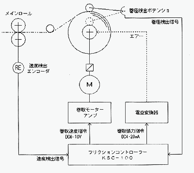 タッチレバーに取付けたポテンショメーターで巻取径を検出し、メインロールに取付けたロータリーエンコーダーで運転速度を検出する。これによって、エアーフリクションシャフトの入力回転数を、巻取径の変化にかかわらず、常に、実巻取回転数に設定、UP回転数をプラスした回転数を入力することができます。